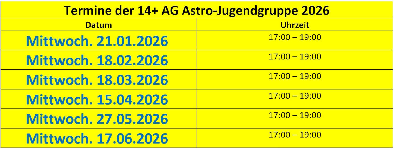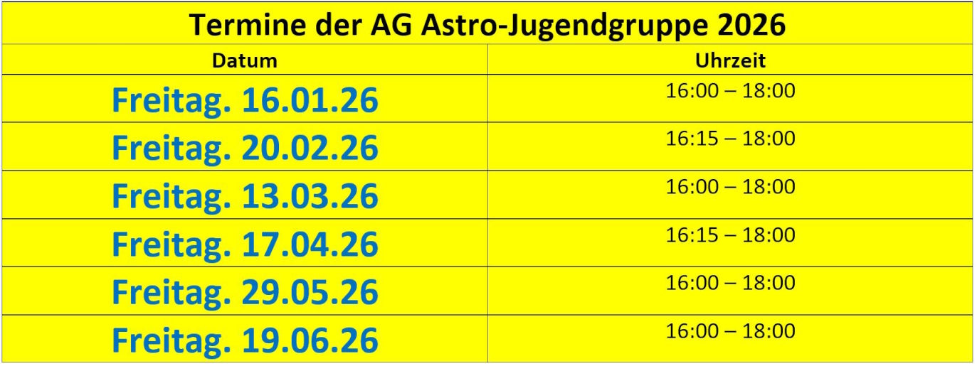 jugendarbeitHier in der Astronomie-Jugendgruppe wollen wir Jugendlichen, die astronomisch interessiert sind, Wissen in den Bereichen Astronomie und den angrenzenden Wissenschaften vermitteln.
